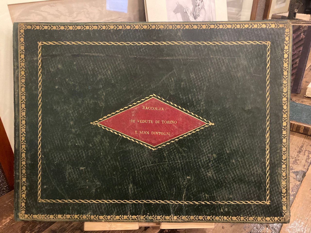 Album in 2° oblungo (41x30 cm), 2 parti in un volume. Completa delle 24 tavole tavole incise all'aquatinta, inclusi i frontespizi. Bella legatura coeva in marocchino verde a grana lunga con titolo in oro entro tassello rosso al piatto anteriore, fregi a catenella e a fiori ai piatti. Conservate le belle brossure originali della seconda raccolta. Rara edizione completa di questa affascinante raccolta di vedute della città di Torino e dei suoi dintorni, firmate in lastra dai disegnatori e dagli incisori, in calce il titolo in italiano e francese. Collaborarono alla raccolta diversi disegnatori e incisori, non soltanto torinesi: Luigi Vaca (Vacca), A. J. Moutier, A. Chenavard; Carolina Lose, Antonio Biasioli (noto soprattutto come pittore teatrale), F. Castelli, Angeli, Castellini. La raccolta è dedicata non casualmente al marchese Thaon di Revel Governatore Militare di Torino, figura emblematica nel rientro dei Savoia nella capitale subalpina. Peyrot, Torino nei secoli, nr 315.