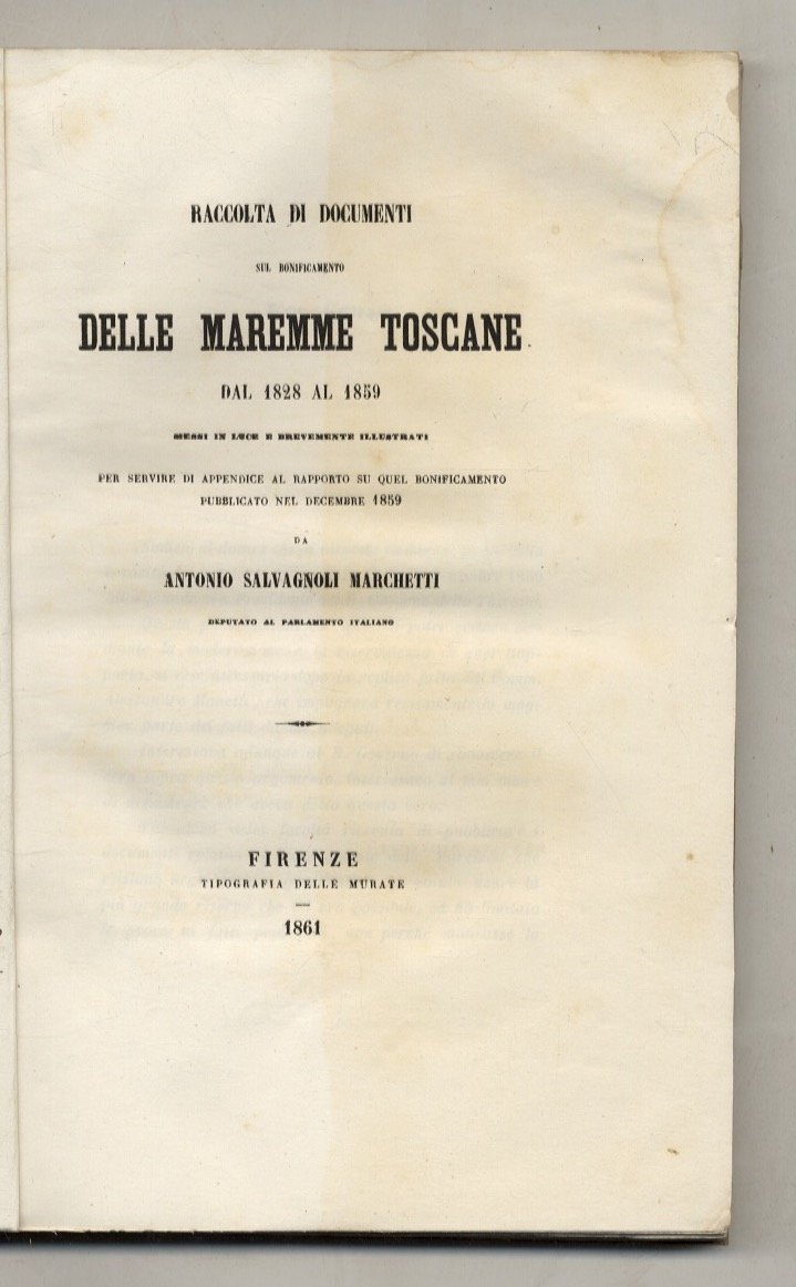 Raccolta di documenti sul bonificamento delle maremme toscane dal 1828 al 1859. Messi in luce e brevemente illustrati per servire di appendice al rapporto su quel bonificamento pubblicato nel decembre 1859 da Antonio Salvagnoli Marchetti. | Libri antichi e moderni |