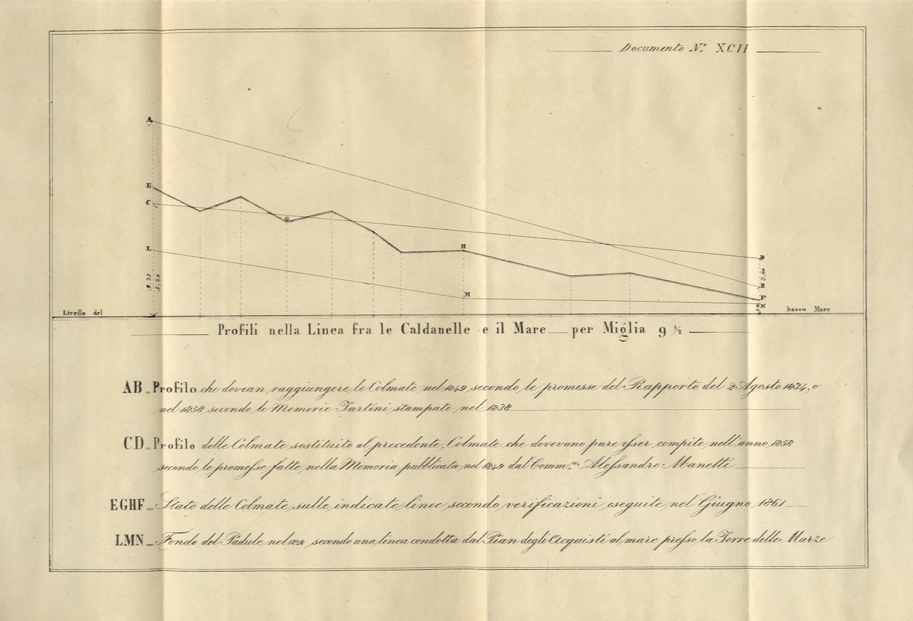 Firenze, Tip. delle Murate, 1861, in-8 grande, brossura editoriale, pp. [4], 184. Con una tavola più volte ripiegata in fine ("Profili nella linea fra le Caldanelle e il Mare per Miglia 9 e mezzo"). Con il motu proprio del 28 novembre 1828, il granduca Leopoldo II avviava la grande bonifica per colmata della pianura maremmana; venne istituita una "Commissione idraulico-economica per la fisica riduzione della Maremma" allo scopo di delineare le linee programmatiche dell'ambizioso programma di lavoro, su modello della deputazione per la Valdichiana di Vittorio Fossombroni, distaccata ad Arezzo. La commissione era composta dal direttore Federico Capei, dal ministro economo Giacomo Grandoni e dall'architetto idraulico Alessandro Manetti. L'ente, che prese il nome di Ufficio di Bonificamento delle Maremme nel 1833, dipendeva direttamente dal granduca. Dopo la caduta del granducato nel 1859, nella fase del Governo provvisorio della Toscana, l'ufficio cambiò nome in "Direzione idraulica per il bonificamento della Maremma" e venne nominato direttore dell'ente l'ingegnere Francesco Renard, che faceva capo a Gaetano Giorgini e Antonio Salvagnoli Marchetti, rivali del Manetti e contrari alle teorie del Fossombroni. Qualche leggera ondulazione, ma esemplare in ottime condizioni ed intonso.