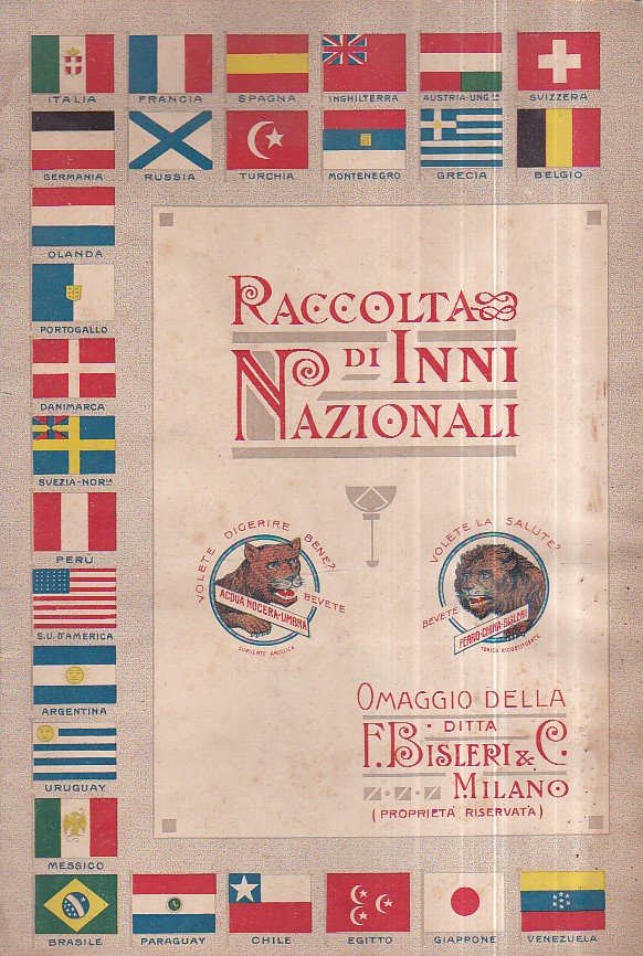 In-8°, pp. 24, brossura editoriale illustrata a colori con pubblicità della ditta Bisleri di Milano e dei suoi prodotti (fra cui la celebre ferrochina) e con bandiere di nazioni del mondo. Al piatto posteriore, pubblicità litografica figurata di altri prodotti Bisleri. Ex-libris di Cesare Maria De Vecchi di Val Cismon. Ottimo stato, salvo alcuni aloni d'umido lievi. Raccolta dei principali inni nazionali del mondo.