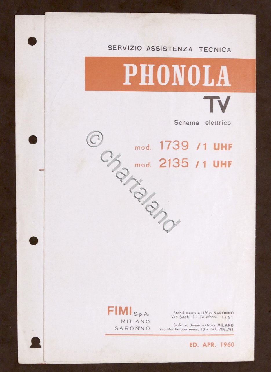 Radiotecnica - Phonola Tv - Schema elettrico mod. 1739 / 1 UHF - 2135 / 1 UHF - ed. 1960 Un foglio. Disegno tecnico sul retro. Testo in italiano. Condizioni molto buone.