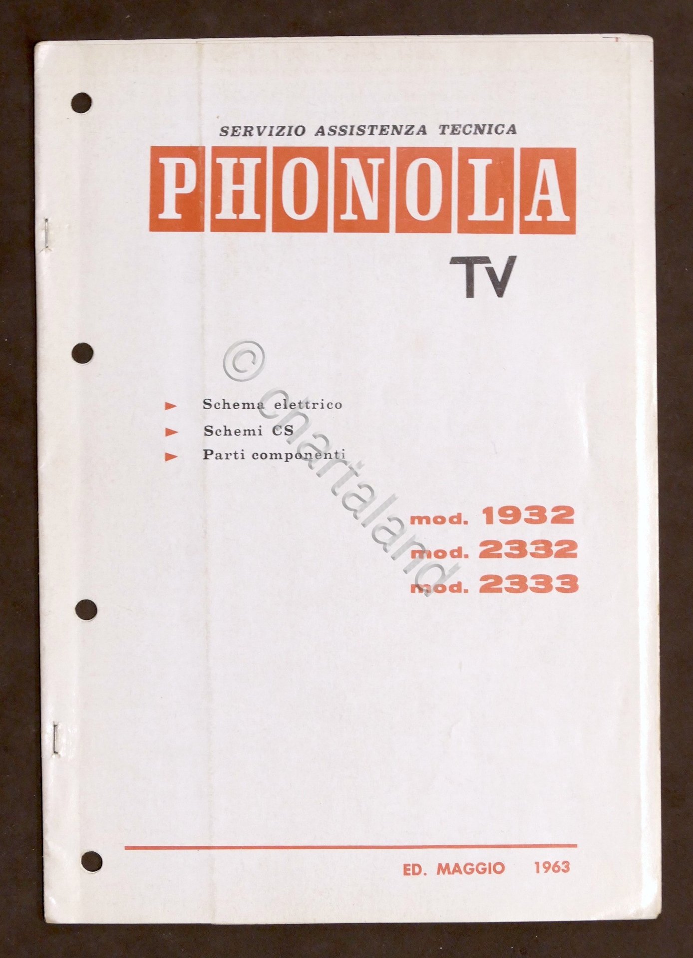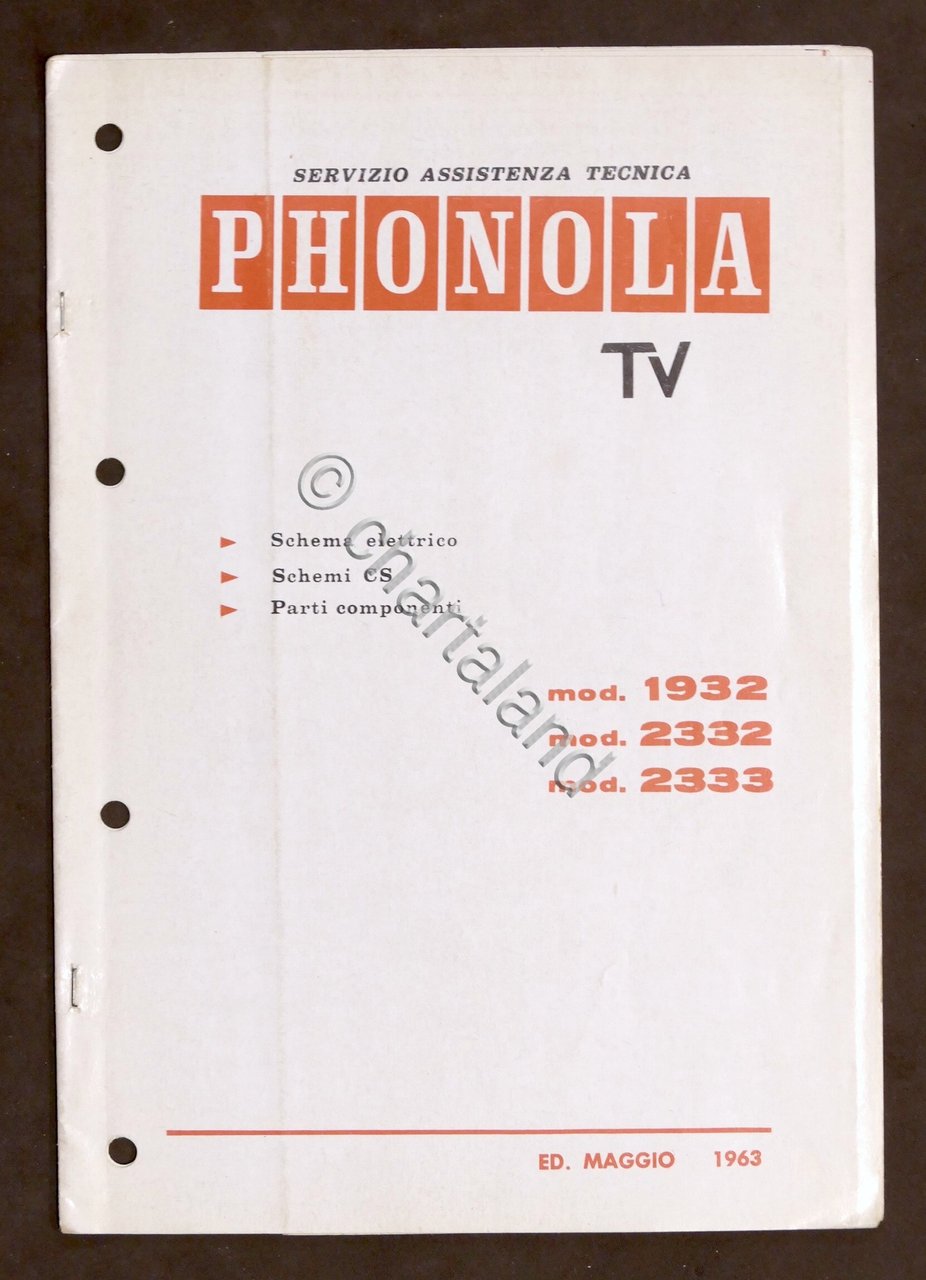 Radiotecnica - Phonola Tv - Schema elettrico - Schemi CS - Parti componenti - ed. 1963 mod. 1932 - 2332 - 2333 Copertina morbida. Testo in italiano. Buone condizioni.