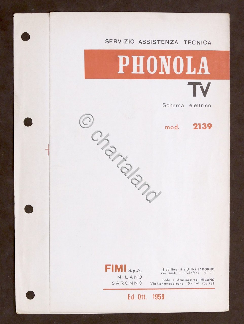 Radiotecnica Phonola Tv Schema elettrico - mod. 2139 - ed. 1959 | Libri antichi e moderni |
