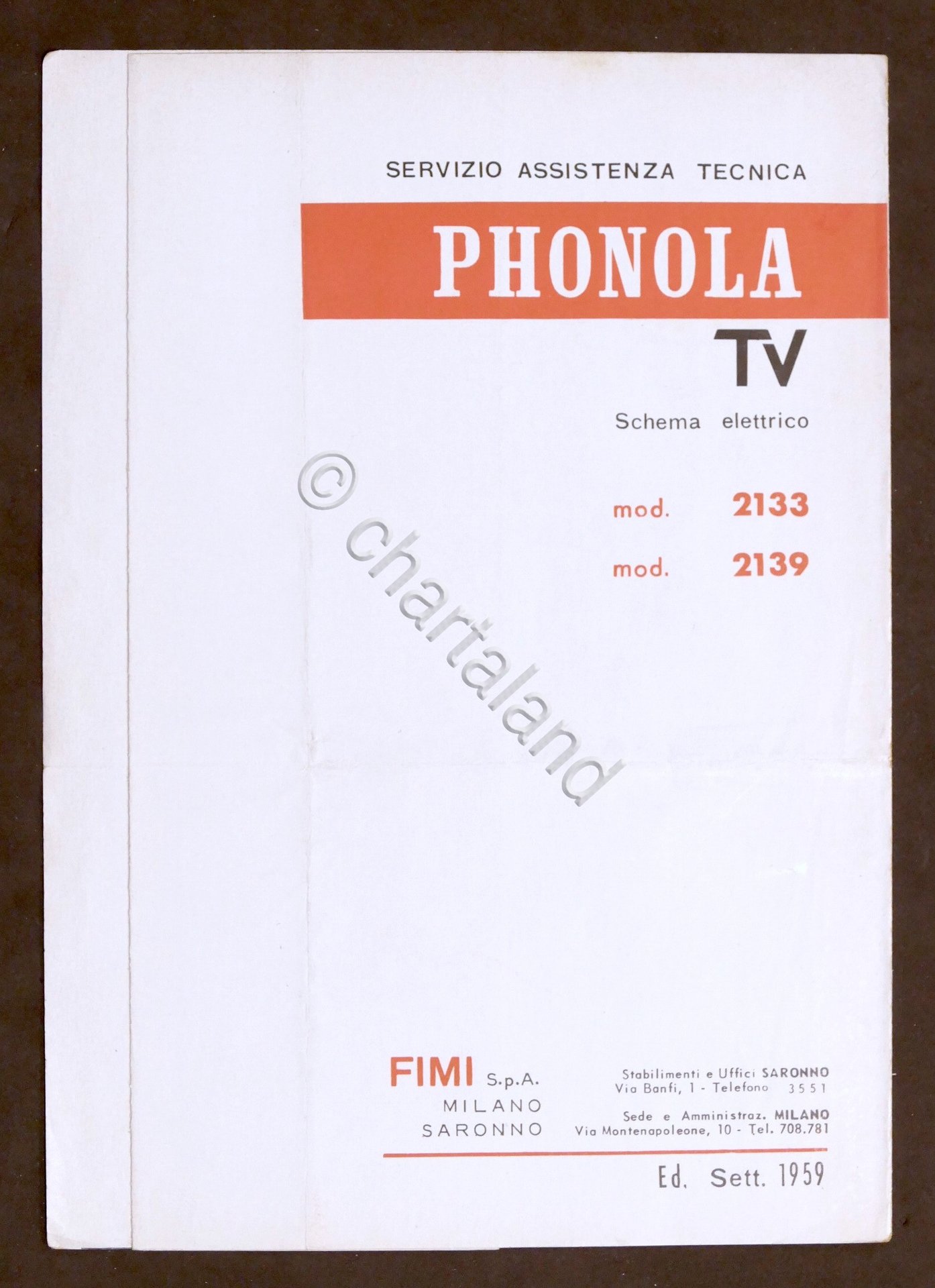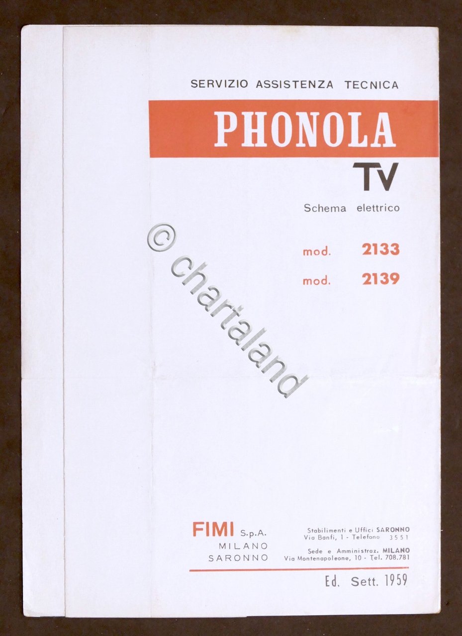 Radiotecnica - Phonola Tv - Schema elettrico mod. 2133 - mod. 2139 - ed. 1959 Un foglio. Disegno tecnico sul retro. Testo in italiano. Condizioni molto buone.