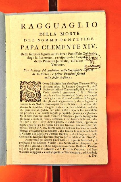 Ragguaglio della morte del sommo pontefice papa Clemente XIV. Delle funzioni seguite nel palazzo pontificio Quirinale, dopo la sua morte, e trasporto del corpo dal detto palazzo Quirinale, all'altro Vaticano. | Libri antichi e moderni |