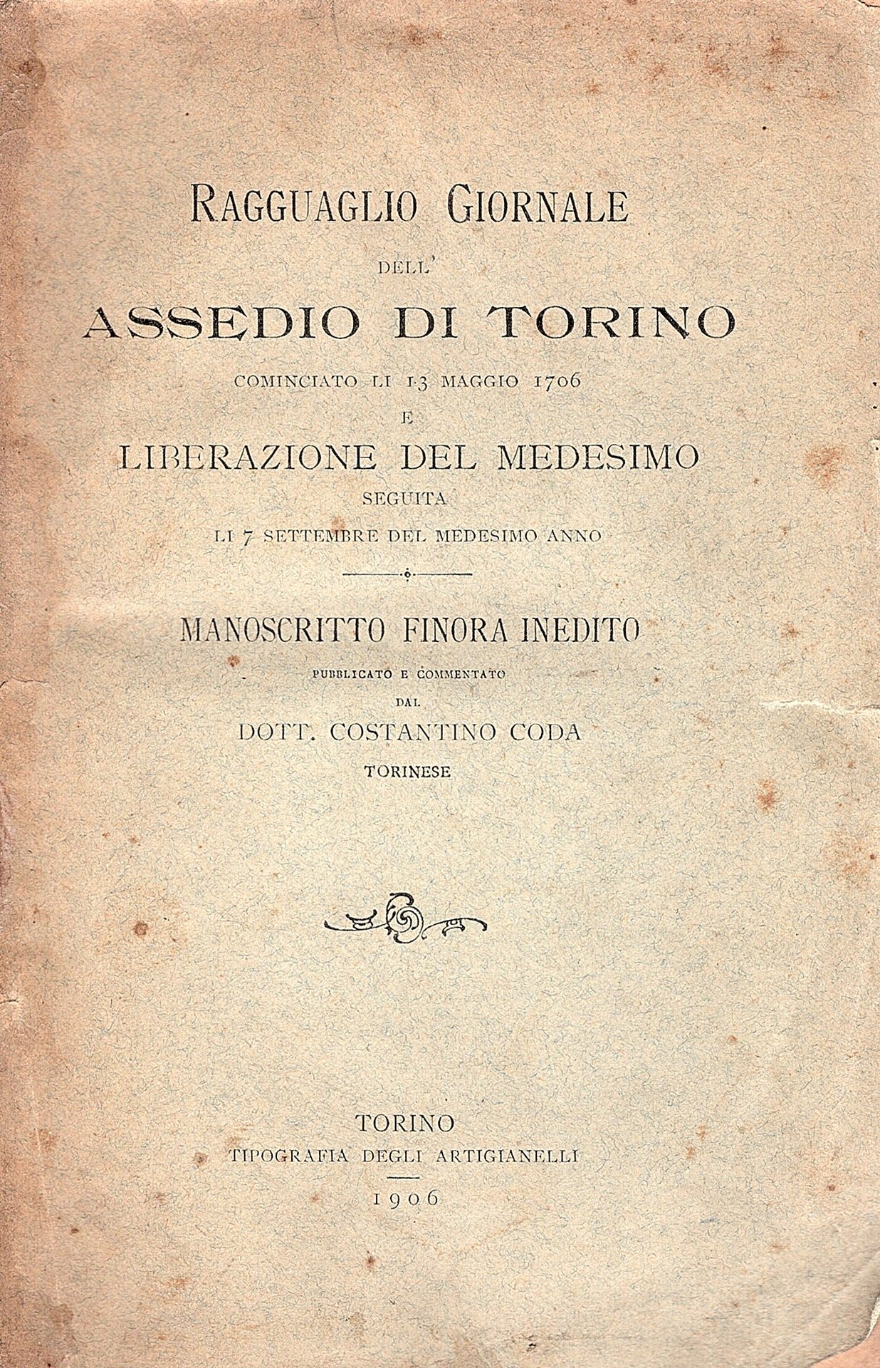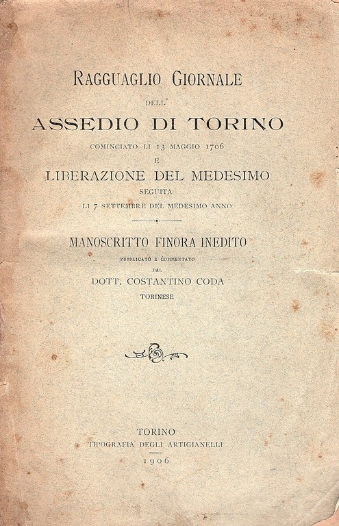 Ragguaglio Giornale dell'Assedio di Torino cominciato li 13 maggio 1706 e liberazione del medesimo seguita li 7 settembre del medesimo anno. Manoscritto finora inedito pubblicato e commentato dal dott. Costantino Coda