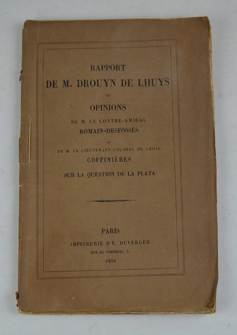 Rapport de M. Drouyn de Lhuys et opinions de M. le contre-amiral Romain-Desfossés et de M. le lieutenant-colonel du génie Coffinières sur la question de La Plata. | Libri antichi e moderni | Drouyn De Lhuys Edouard.