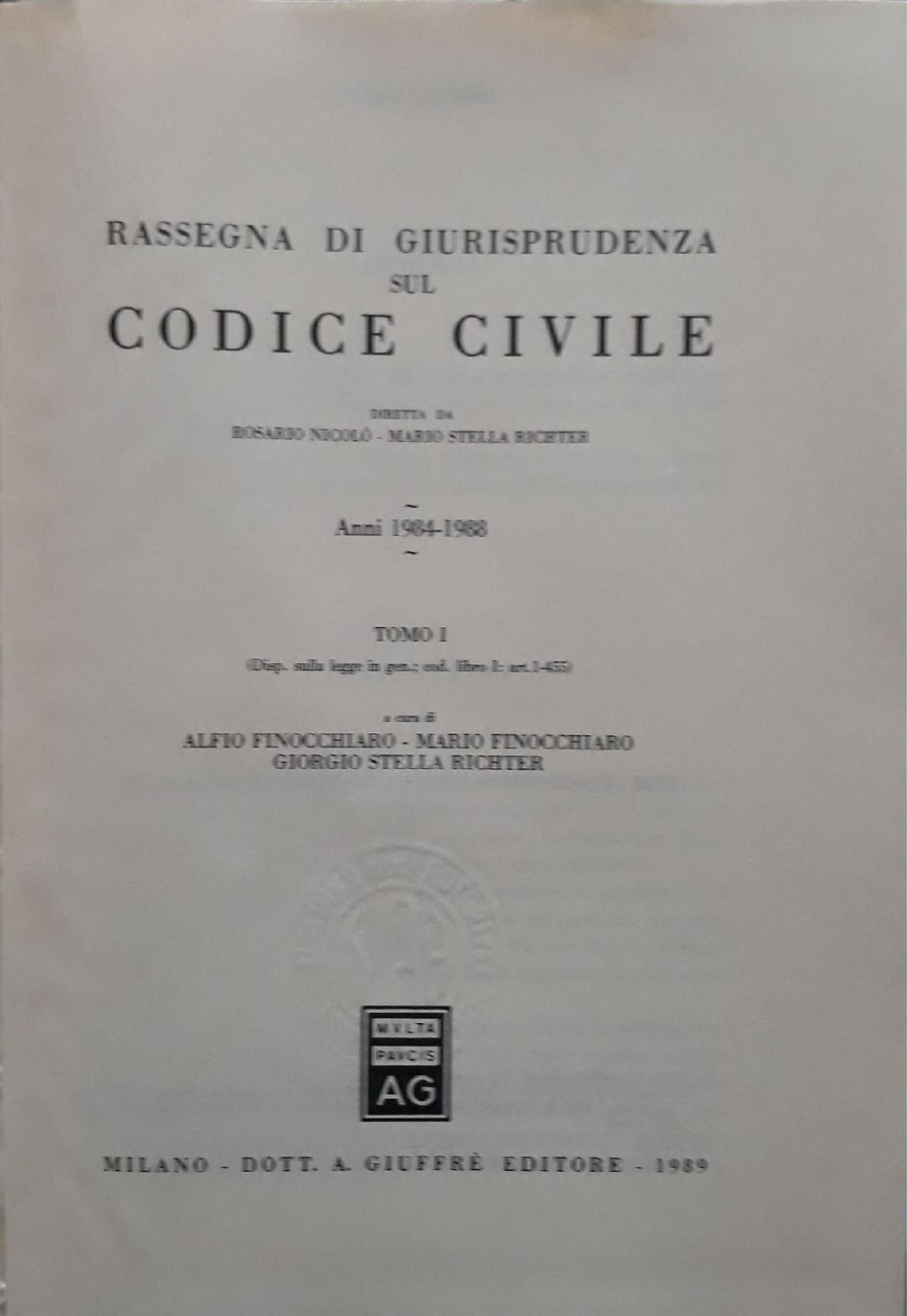 Rassegna di giurisprudenza sul Codice civile. Anni 1984-1988. Artt. 1 - 455 Tomo 1) | Libri antichi e moderni | Rosario Nicolò, Mario Stella Richter, ,Rosario Nicolò, Mario Stella Richter