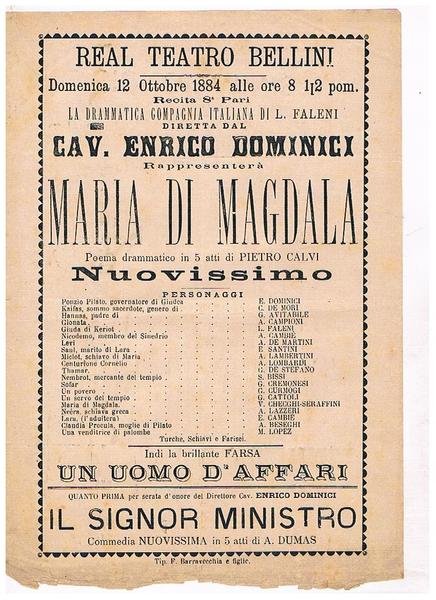 Real Teatro Bellini, il 12 ottobre 1884 la drammatica compagnia italiana di L. Faleni diretta dal cav. Enrico Dominici rappresenterà Maria di Magdala, poema drammatico in 5 atti di Pietro Calvi, indi la brillantissima farsa un uomo d'affari.