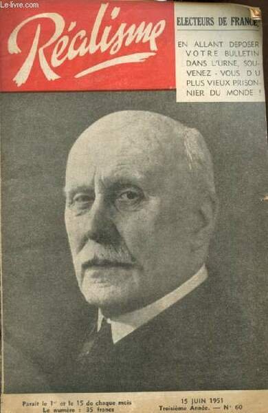 Réalisme, 3e année, n°60 (15 juin 1951) : Au Maréchal (André Joussain) / Les listes "U.N.I.R." / Chez les gaullistes / L'oeuvre de Charlebagne (C.R.) / Pour la justice scolaire (Jean Remois) /. | Libri antichi e moderni | Giroux Robert & Collectif