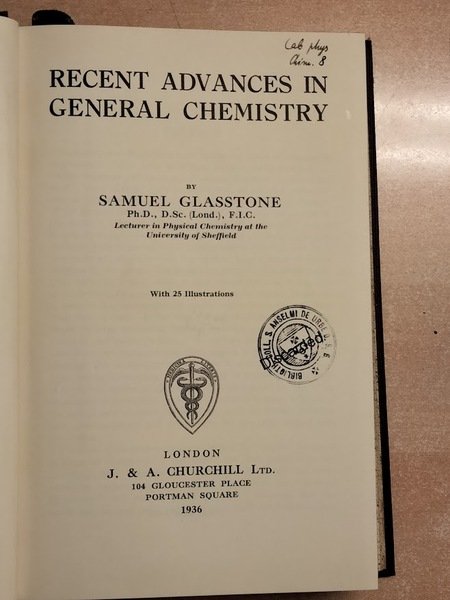 Recent Advances in General Chemistry. | Libri antichi e moderni | Glasstone Samuel.