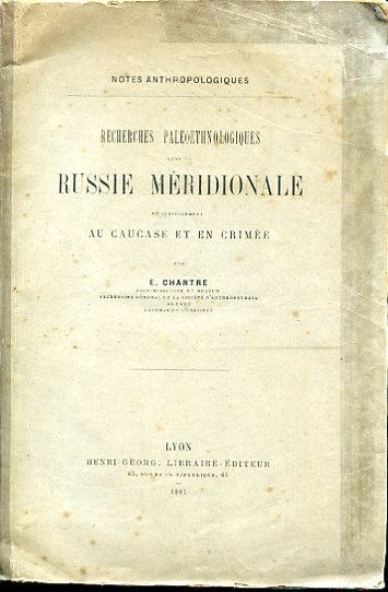 In-4° piccolo, pp. 27, brossura editoriale a stampa grigia (la brossura posteriore è ricostituita). 12 tavv. f.t. incise in litografia e impresse da Roux di Lione raffiguranti armi dell'età del bronzo, statuette, monili, vasellame, punte di lance, archi, crani umani, etc., ritrovati nelle necropoli caucasiche di Samthavro, Corveissiat, Koban, Kazbek, e conservati nel Museo della Società Archeologica di Tiflis, al Museo di Storia Naturale di Lione, al Museo del Cremlino. Restauri alla brossura. Fioriture. Prima edizione di rara memoria paleoetnologica dello Chantre, Segretario generale della Società di Antropologia lionese, afferente ai ritrovamenti archeologici dell'età del bronzo in Russia meridionale, e segnatamente in Crimea e in Caucaso. Interessanti cenni su crani macrocefali ritrovati in necropoli locali, sul costume caucasico di deformare la testa dei bambini appena nati, sui monumenti megalitici, etc. Lo Chantre (Lione, 1843-ivi, 1924) fu antropologo, storico, geologo, etnologo ed archeologo autore di importanti scavi in Russia, Turchia, Austria, Francia, Africa del Nord, etc. Le sue ricerche in Caucaso confluirono in quattro volumi editi a Lione tra il 1885 e il 1887. Vapereau, p. 315.