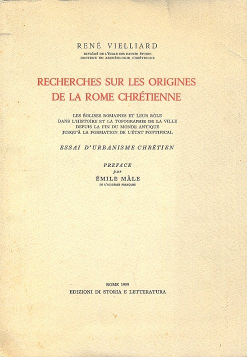 Recherches sur les origines de la Rome chretienne. Les eglises romaines et leur role dans l'histoire et la topographie de la ville depuis la fin du monde antique jusq'à la formation de l'etat pontifical. Essai d'urbanisme chretien. Preface par Emile Male. | Libri antichi e moderni | Vielliard Rene'.