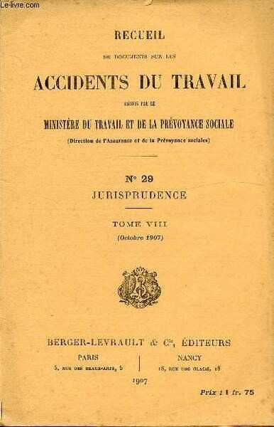 RECUEIL DE DOCUMENTS SUR LES ACCIDENTS DU TRAVAIL - N�29 - JURISPRUDENCE - TOME VIII ( OCTOBRE 1907 ) | Libri antichi e moderni | Ministere Du Travail Et De La Prevoyance Sante