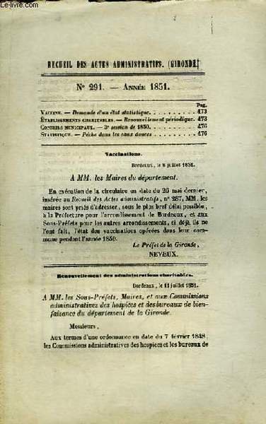 Recueil des Actes Administratifs N°291 - Année 1851 : Pêche dans les eaux douces. | Libri antichi e moderni | Departement De La Gironde