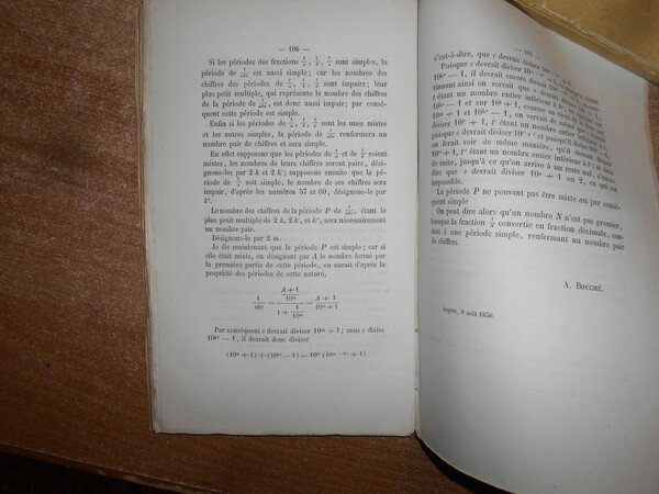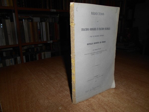 Réduction des Fractions Ordinaires En Fractions Décimales par un procédé nouveau. Nouvelles propriétés des périodes par AUGUSTE, BOUCHE' ancien élève de l' école normale, professeur de Mathématiques à l' école supérieure et au Lycée d' Angers. Angers, Imprimerie de Cosnier et Lachèse, 1857. In-8°, br. 108 pp. con dedica e firma dell' Autore. Not in Poggendorf. In ottimo stato di conservazione. Neg. mob. 8 entro busta trasp.