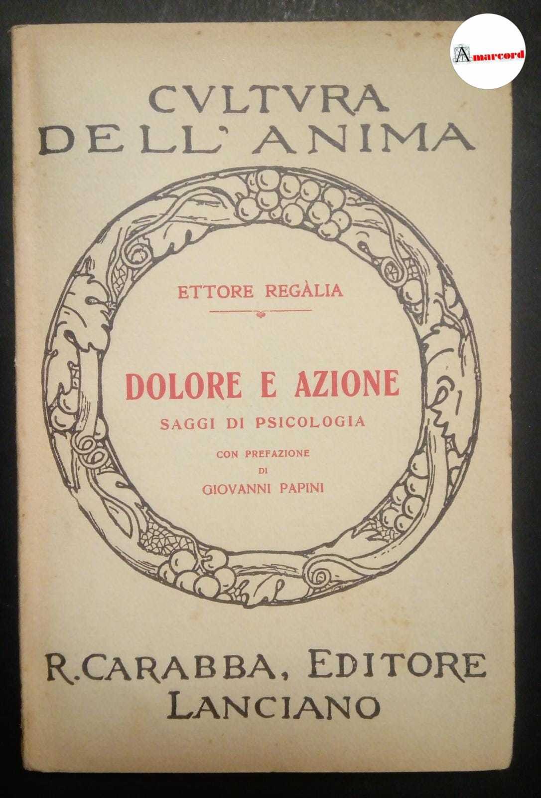 Regalia Ettore, Dolore e Azione, Carabba, 1934, in-16, brossura editoriale, pp.126. Prefazione di Giovanni Papini.