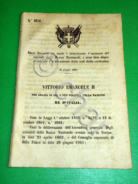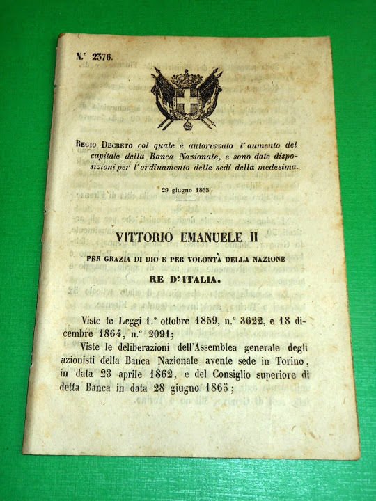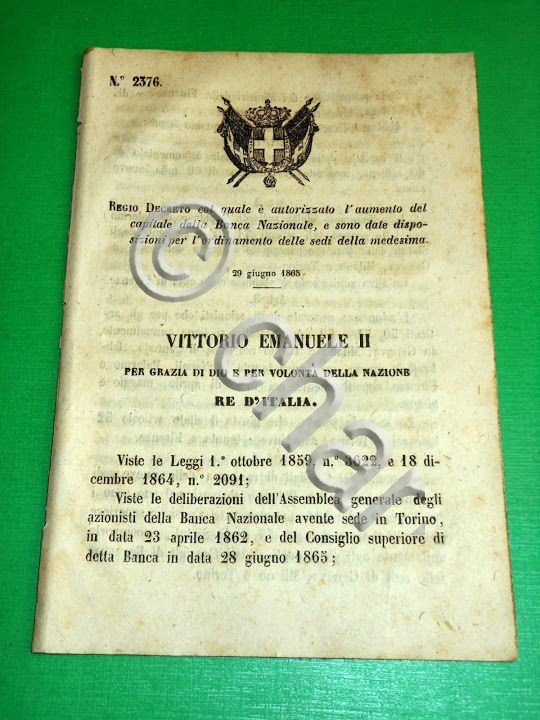 Regno d' Italia Regio Decreto Aumento di Capitale della Banca Nazionale 1865 | Libri antichi e moderni |