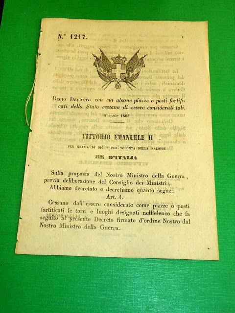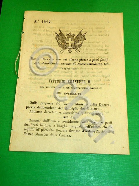 *** Atti del Governo di S. M. il Re d' Italia: "Reggio Decreto con cui alcune piazze o posti fortificati dello Stato cessano di essere considerati tali" Alcuni dei posti nominati nel decreto: Torre del Porto di Pesaro, Forte di Prto d' Ascoli, Forte Bibbone, Torre Ardenza, Torre Calagrande, ecc. Data a Torino, 8 Aprile 1863. Pagine 3.Per appassionati studiosi e collezionisti