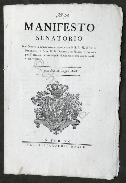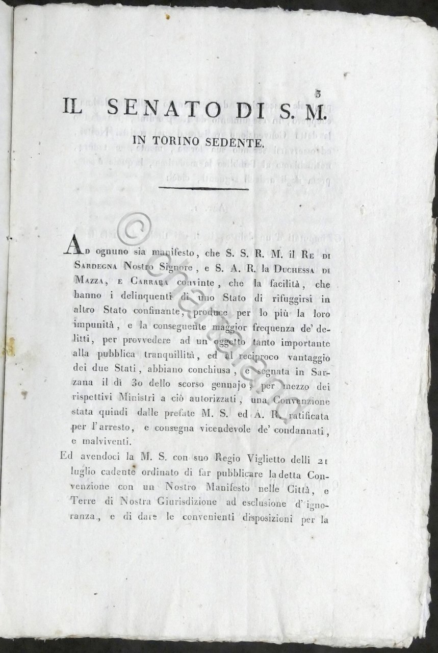 Manifesto Senatorio notificante la convenzione tra Regno di Sardegna e Ducato di Massa e Carrara per l'arresto e la consegna vicendevole dei condannati e malviventi - 28 Luglio 1818