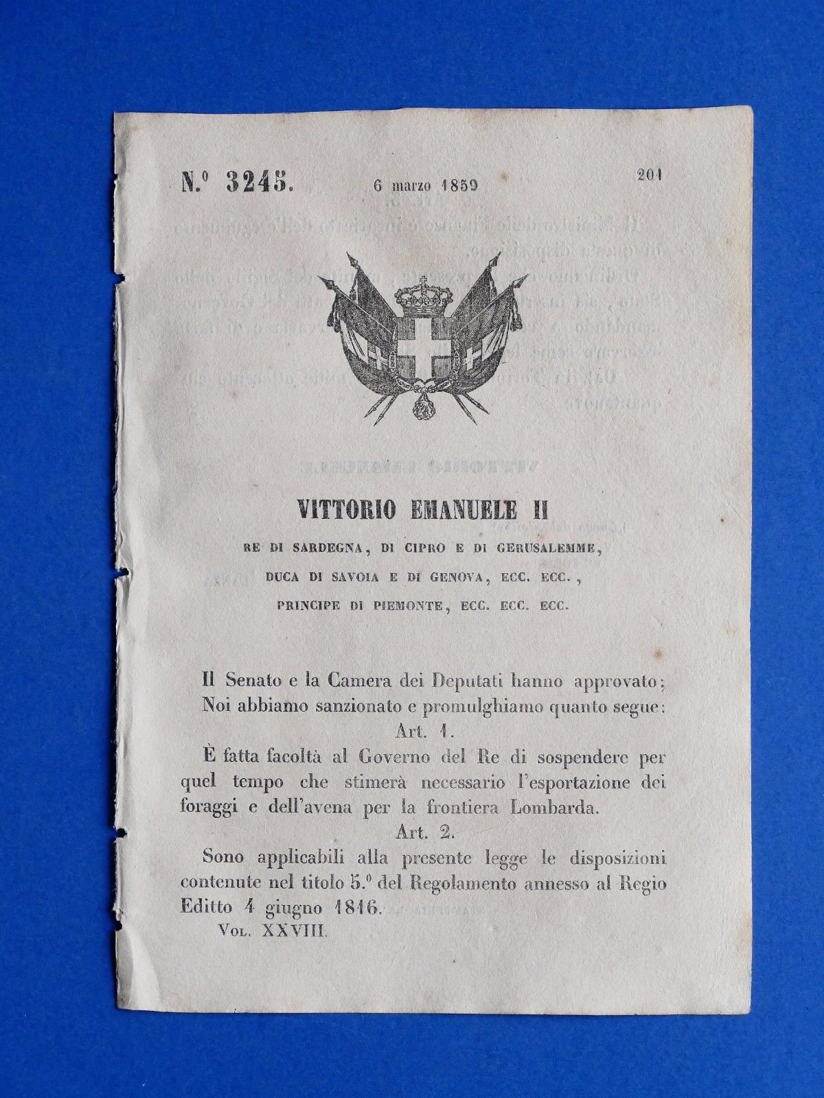 Regno di Sardegna - Regio Decreto Sospensione esportazione foraggi - 1859 | Libri antichi e moderni |