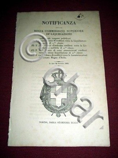 *** Atti del Governo di S. M. il Re di Sardegna: "... Notificanza della Regia Commissione Superiore di Liquidazione colla quale vengono pubblicati (A) Un nuovo elenco di creditori verso la Liquidazione Francese di I^ classe ..." Torino, 20 dicembre 1831. Pagine 15.Per appassionati studiosi e collezionisti