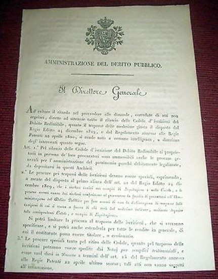 *** Regno di Sardegna: "Amministrazione del Debito Pubblico, Il Direttore Generale ad evitare il ritardo nel provvedere alle dimande, corredate di atti non regolari, dirette ad ottenere tanto il rilascio delle Cedole d' iscrizioni del Debito Redimibile, quanto il trapasso delle medesime giusta il disposto dal Regio Editto 24 dic. 1819 ... si rende noto a comune intelligenza, e direzione degl' interessati quanto segue ..." Torino, 19 settembre 1820. Pagine 4. Per appassionati studiosi e collezionisti