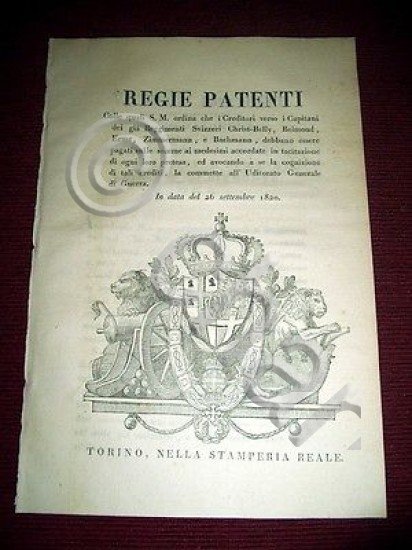 *** Regno di Sardegna: "Regie Patenti colle quali S. M. ordina che i Creditori verso i Capitani dei già Reggimenti Svizzeri Christ-Belly, Belmond, Ernst, Zimmermann e Bachmann, debbano essere pagati sulle somme ai medesimi accordate in tacitazione di ogni loro pretesa, ed avocando a se la cognizione di tali crediti, la commette all' Uditorato Generale di Guerra ..." Torino, 26 settembre 1820. Pagine 8. Per appassionati studiosi e collezionisti