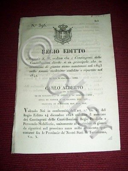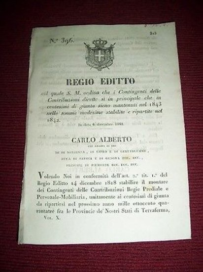 *** Atti del Governo di S. M. il Re di Sardegna: "Regio Editto col quale S. M. ordina che i Contingenti delle Contribuzioni dirette sì in centesimi di giunta sieno mantenuti nel 1843 nelle somme medesime stabilite e ripartite nel 1842 ..." Torino, 6 dicembre 1842. Pagine 3.Per appassionati studiosi e collezionisti