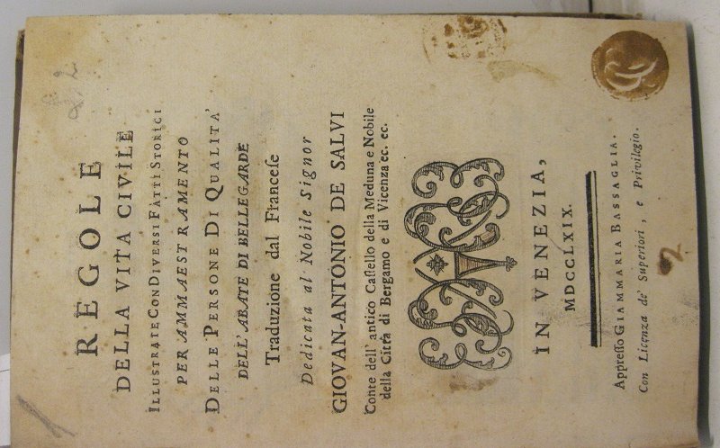 REGOLE DELLA VITA CIVILE, illustrate con Diversi Fatti Storici per ammaestramento delle persone di Qualita' dell'abate di Bellegarde. Traduzione dal Francese, dedicata al Nobile Signor Giovan - Antonio De Salvi. Conte dell'antico Castello Della Meduna e Nobile della Citta' di Bergamo e di Vicenza ec. ec.