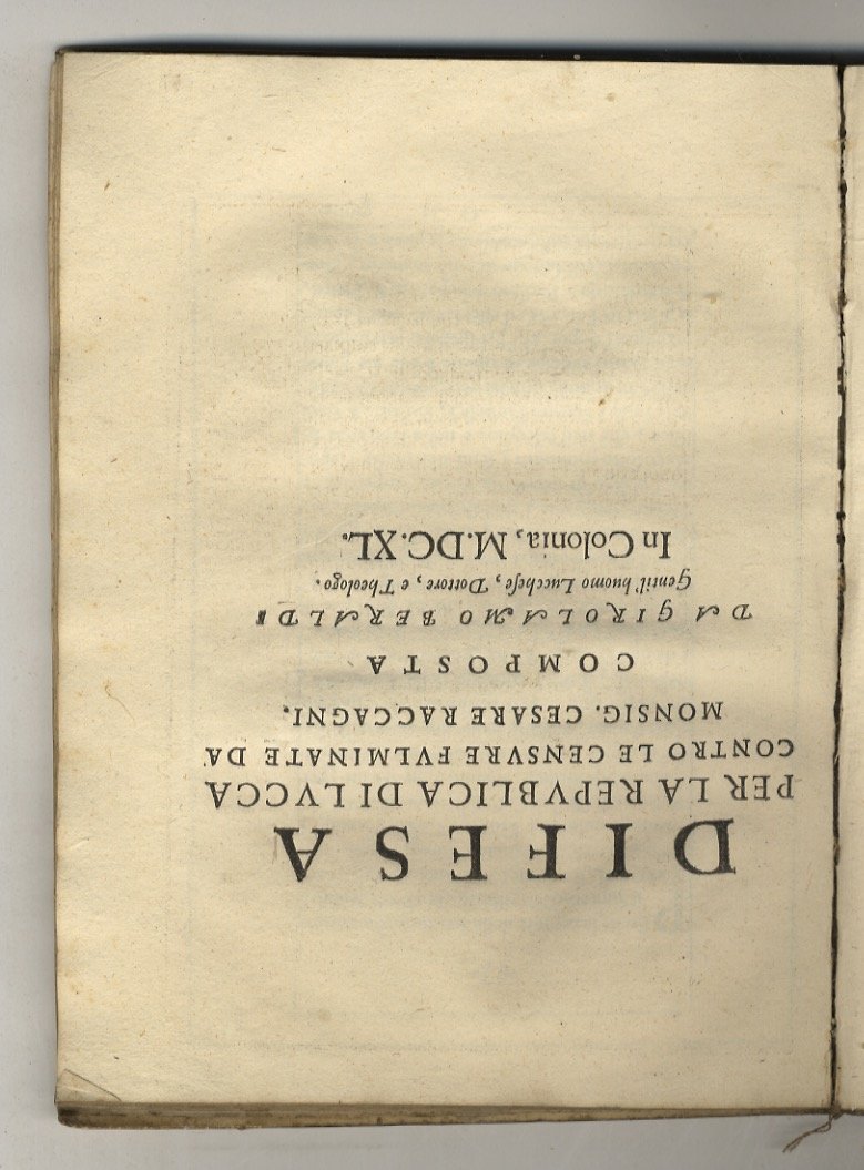 In Colonia [ma prob. Lucca], [s.n.t.], 1640, in-4, legatura coeva in piena pergamena floscia, pp. 98. Errori di numerazione delle pagine. Girolamo Beraldi dovrebbe essere lo pseud. di Lelio Altogradi, cfr. Melzi G., Anonime e pseudonime, v. 1, p. 126. Contiene, con proprio front., "Difesa per la republica di Lucca contro le censure fulminate da monsig. Cesare Raccagni". Libro probabilmente pubblicato a Lucca, qui in prima edizione. Lozzi I, 2379. Ottimo esemplare.