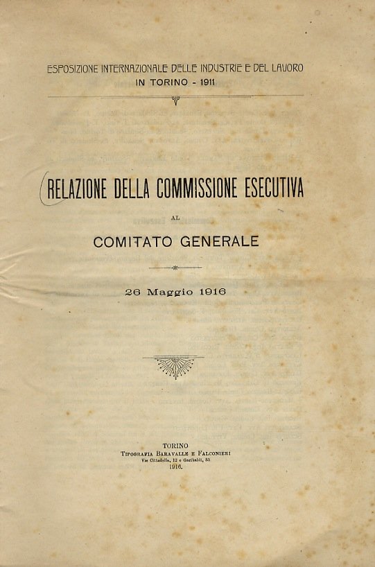 RELAZIONE della Commissione Esecutiva al Comitato Generale. 26 Maggio 1916. Esposizione Internazionale delle Industrie e del Lavoro in Torino - 1911. | Libri antichi e moderni |