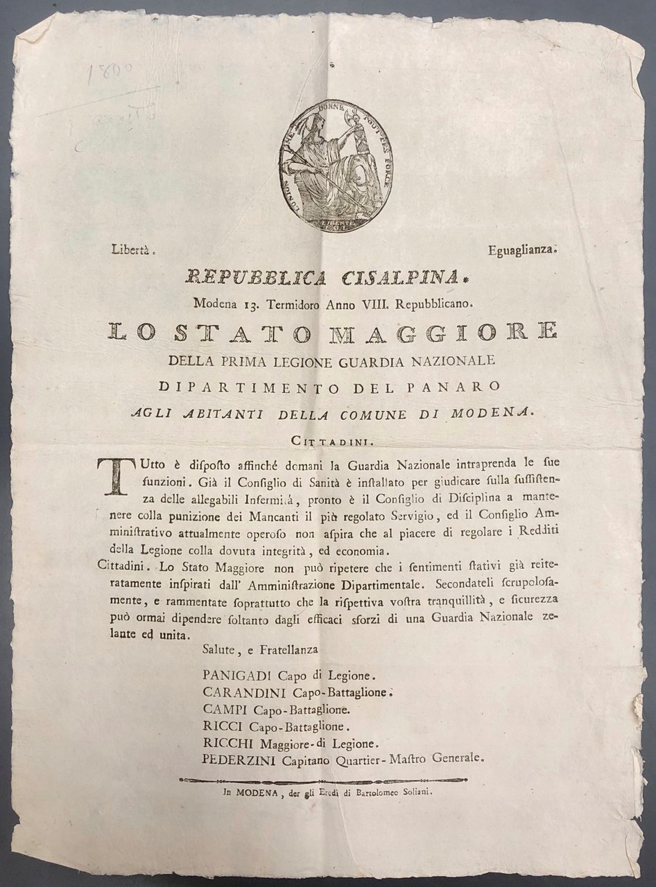 Repubblica Cisalpina. Lo Stato Maggiore perseguendo gli ideali di eguaglianza e libertà comunica ai cittadini di Modena l'inizio delle funzioni della Guardia Nazionale nella città | Libri antichi e moderni | Repubblica Cisalpina
