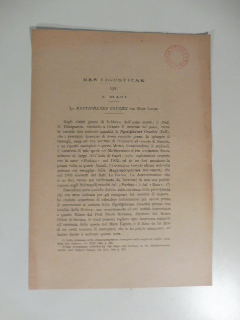 In 8 (cm 17 x 24), pp. 3 + (1b). Esemplare privo di legatura all'origine. Timbro di ex possessore alla prima pagina. Estratto editoriale dagli Annali del Museo Civico di Storia naturale di Genova.