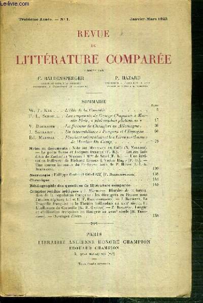 REVUE DE LITTERATURE COMPAREE - TROISIEME ANNEE - N°1 - JANVIER-MARS 1923 - W.P. Ker: l'idée de la Comedie - F.L. Schoell: les emprunts de George Chapman à Marsile Ficin, "philosophus platonicus" - V. Bouillier: la fortune de Chamfort en Allemagne.