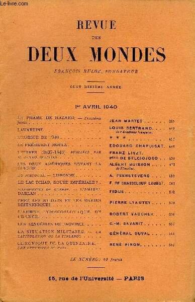 REVUE DES DEUX MONDES CXe ANNEE N°7 - LE PHARE DE HAZARD. — Troisièmepartie. JEAN MARTET. LAMARTINE. LOUIS BERTRAND. de l'Académie française.L’EUROPE DE 1940 . * * *LE PRÉSIDENT MOTTA. ÉDOUARD CHAPUISAT.LETTRES (1837-1840) PUBLIÉES