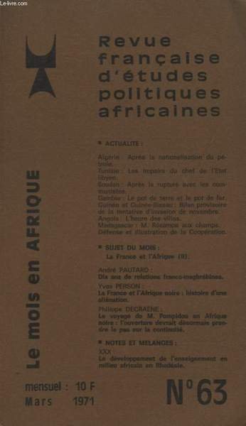 REVUE FRANCAISE D ETUDES POLITIQUES AFRICAINES LE MOIS EN AFRIQUE N�63 : ALGERIE APRES LA NATIONALISATION DU PETROLE - MADAGASCAR M. RESAMPA AUX CHAMPS - LA FRANCE ET L AFRIQUE DIX ANS DE RELATIONS FRANCO MAGHREBINES .