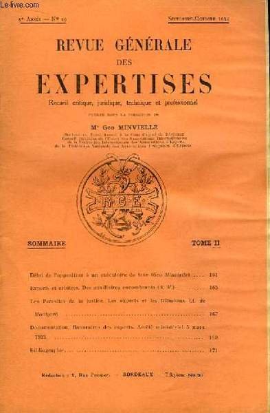 Revue Générale des Expertises. N°29 - 5ème année : Délai de l'opposition à un exécutoire de taxe, par Minvielle - Experts et Arbitres. des auxiliaires encombrants - Les Parasites de la justice, par A. de Montgon . | Libri antichi e moderni | Minvielle Géo