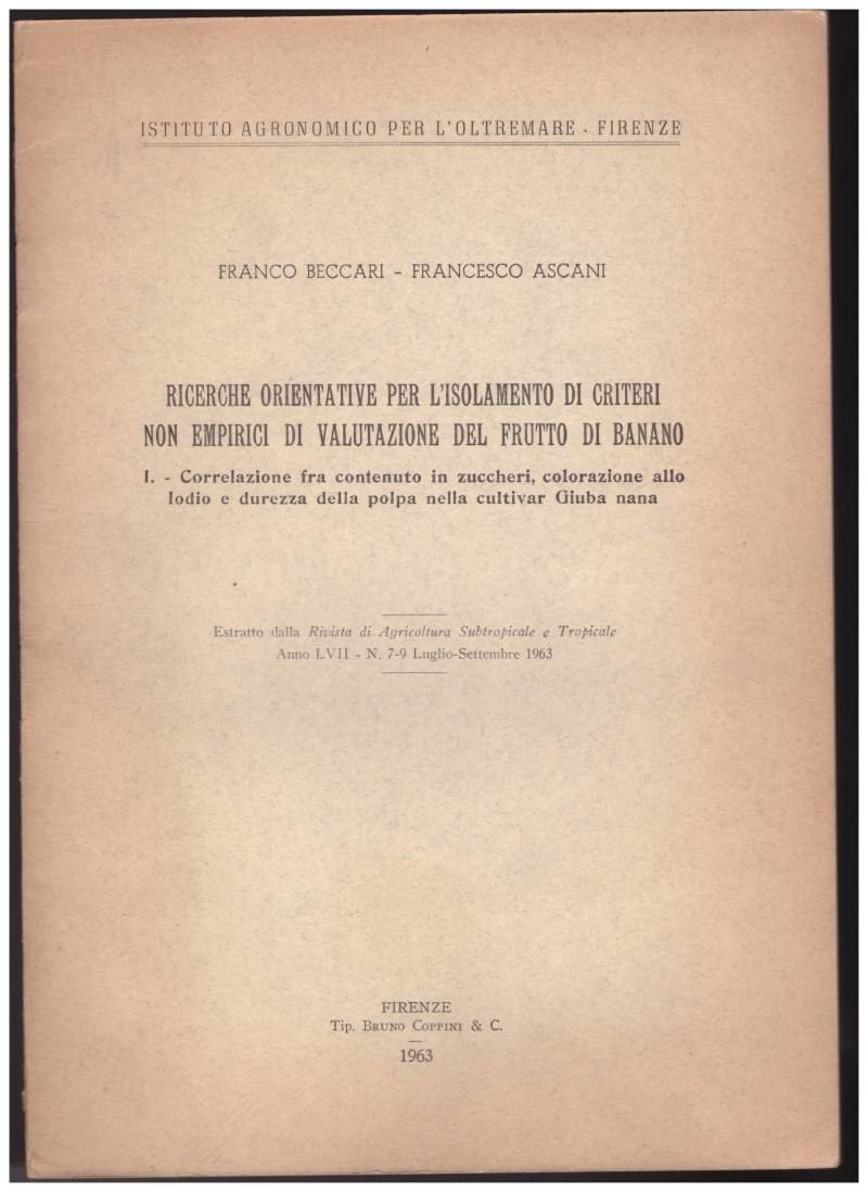 RICERCHE ORIENTATIVE PER L'ISOLAMENTO DI CRITERI NON EMPIRICI DI VALUTAZIONE DEL FRUTTO DEL BANANO | Libri antichi e moderni | Beccari Franco - Ascani Francesco
