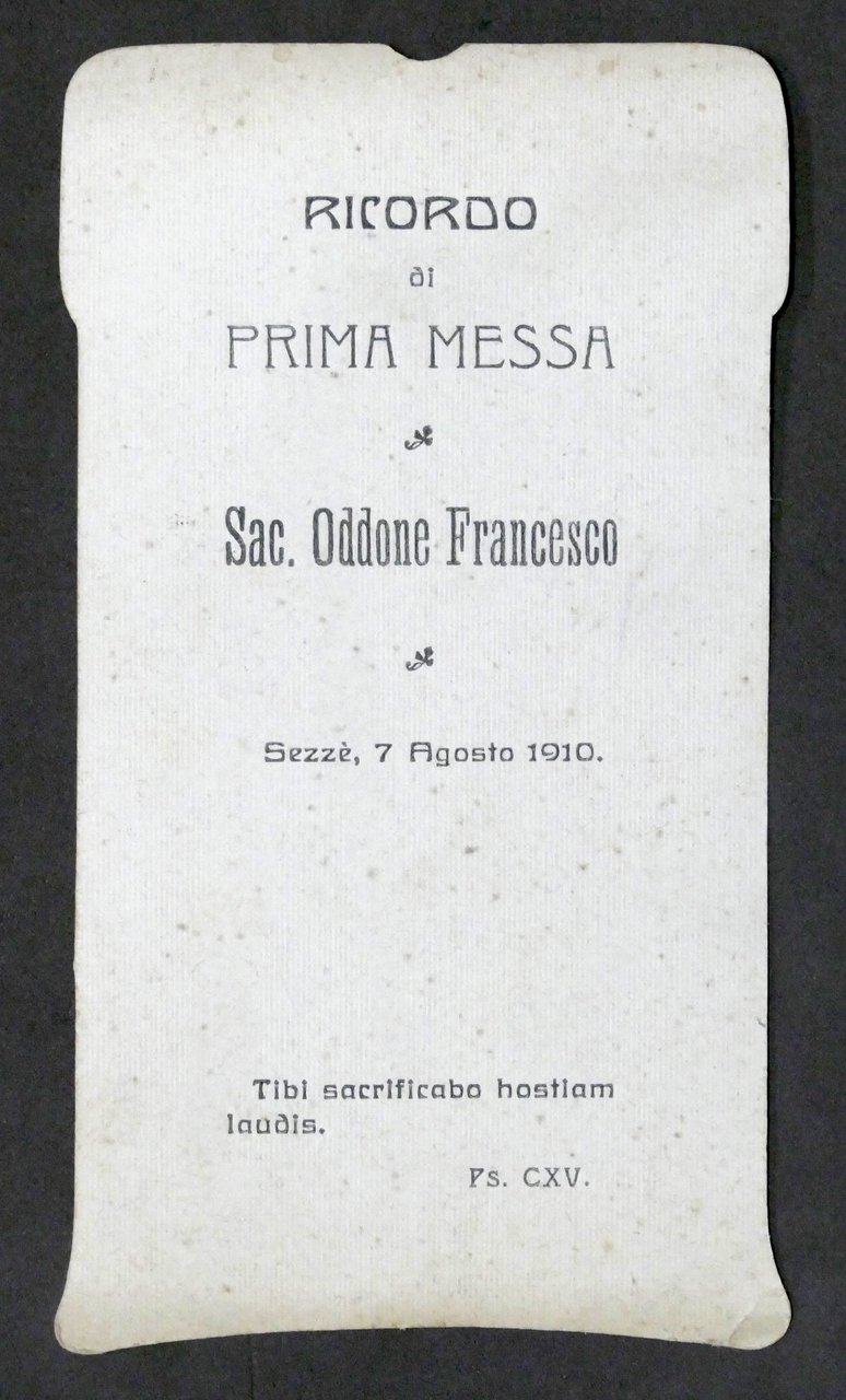 Ricordo di prima messa - Sacerdote Oddone Francesco - Sezzè (Sezzadio attualmente, in provincia di Alessandria) - 1910 Un biglietto, dimensioni: 6 x 11 cm ca. Condizioni generali buone. Piccoli segni del tempo. Â