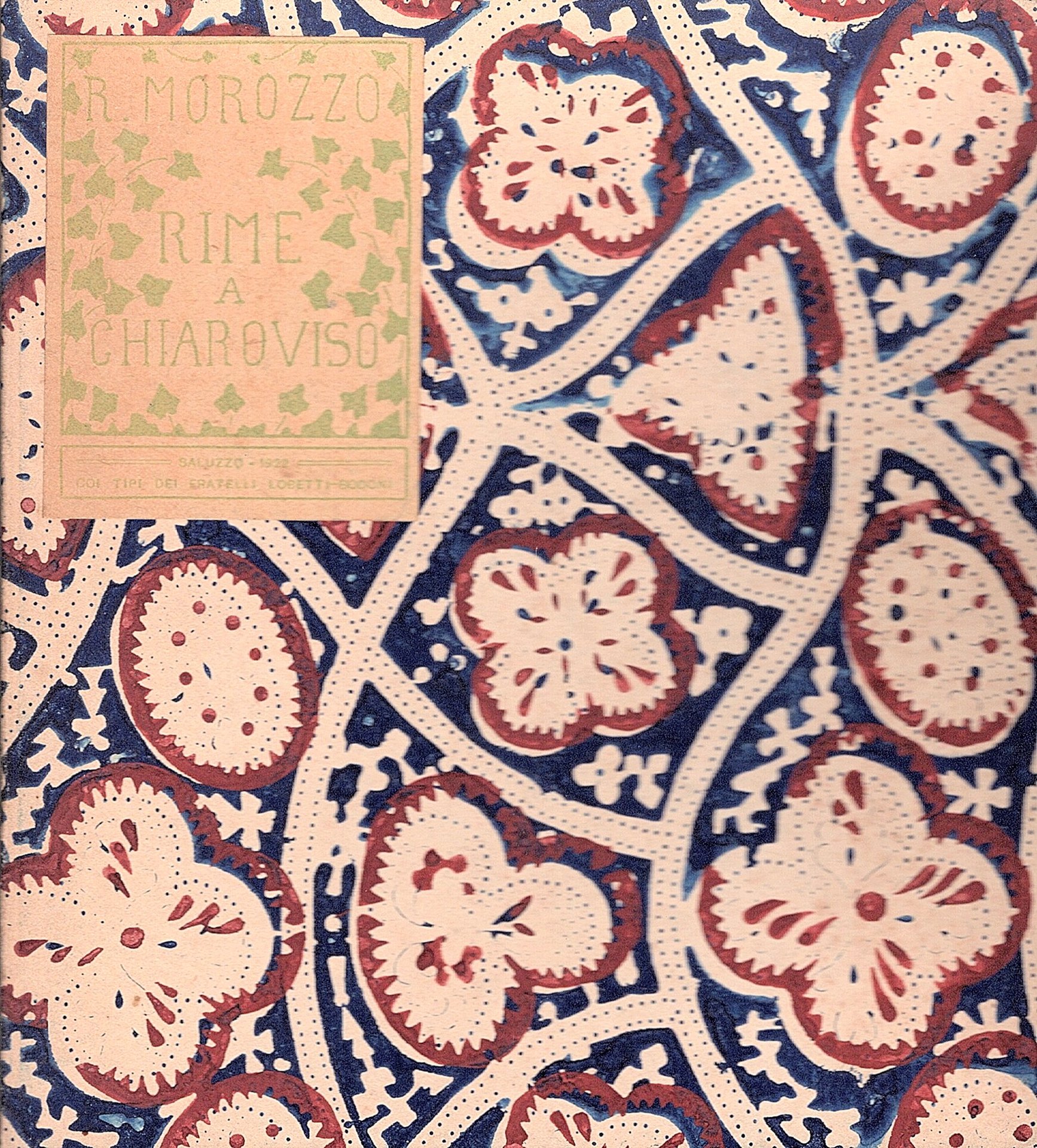 In-16° quadrato (cm. 16.5x15,5), pp. 39 (1), legatura editoriale alla bodoniana in cartoncino decorato déco con titoli su etichetta a stampa applicata al piatto e ornata con motivi fitomorfi, angoli smussati. 4 tavole xilografiche fuori testo, colophon figurato 'Rotbaldus Morotius ornavit', capolèttere ornati. Bella dedica autografa dell'autore al contropiatto anteriore. Copia N°11/500. Ottimo esemplare. Non comune raccolta di liriche d'amor cortese elegantemente stampate e contrappuntate da belle prove xilografiche di Robaldo Morozzo della Rocca che si esprime in uno stile di sintesi tra preraffallita e art déco, e che diventerà importante architetto razionalista.