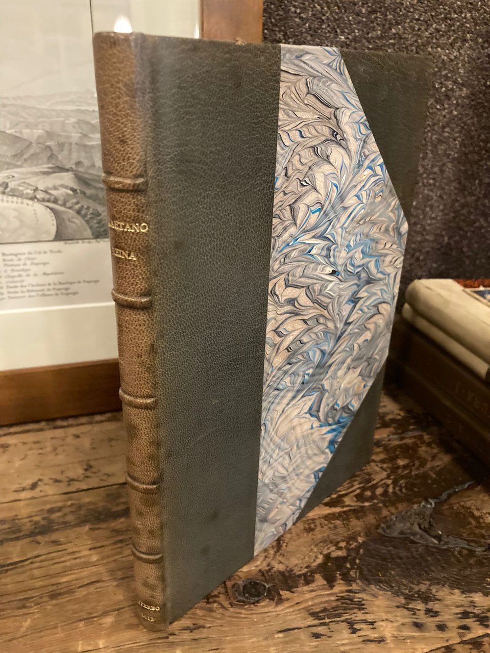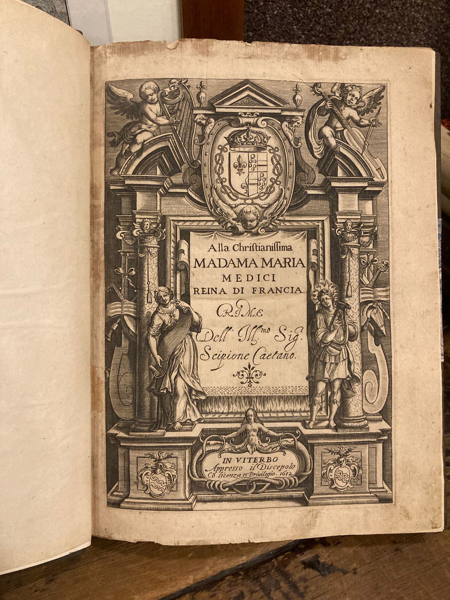 In-4° (240x172mm), pp. (10), 101, (3) di tavola dei sonetti, dei canzoni e dei madrigali, (2) bianche, legatura novecentesca in mezza pelle e angoli con titolo in oro su dorso a nervetti. Piatti e risguardi marmorizzati. Frontespizio inciso su rame con cornice architettonica sormontata dallo stemma della dedicataria, Maria de' Medici, da angeli musicanti, e con varie figurazioni allegoriche. Testatine e capilettera ornati incisi in xilografia. Dedica a stampa a Maria de' Medici di Francesco Fondacci. Bruniture e fioriture sparse, lavori di tarlo marginali non lesivi del testo alle pp. 97-100, macchie marginali alle pp. 97-101 e alle ultime 2 pp. di indice. Restauro al margine interno del verso del frontespizio. Discreto esemplare. Prima e unica edizione, di grande rarità, mancante alla Vinciana. Le liriche, di ispirazione marinista, sono di varia intonazione: accanto a poesie amorose ne figurano altre encomiastiche e d'occasione (dedicate fra l'altro a Enrico IV). Pochissimo conosciuta e studiata è la produzione lirica del Caetani, rappresentata da quest'unico volume; ignoti sono anche gli estremi biografici del Caetani, che era nativo di Roma Alcune sue liriche furono antologizzate dal Croce nella sua famosa antologia laterziana dei 'Lirici marinisti', volume inagurale degli 'Scrittori d'Italia'. Michel / Michel, II, p. 11. Non in Gamba, Vinciana, Moreni.