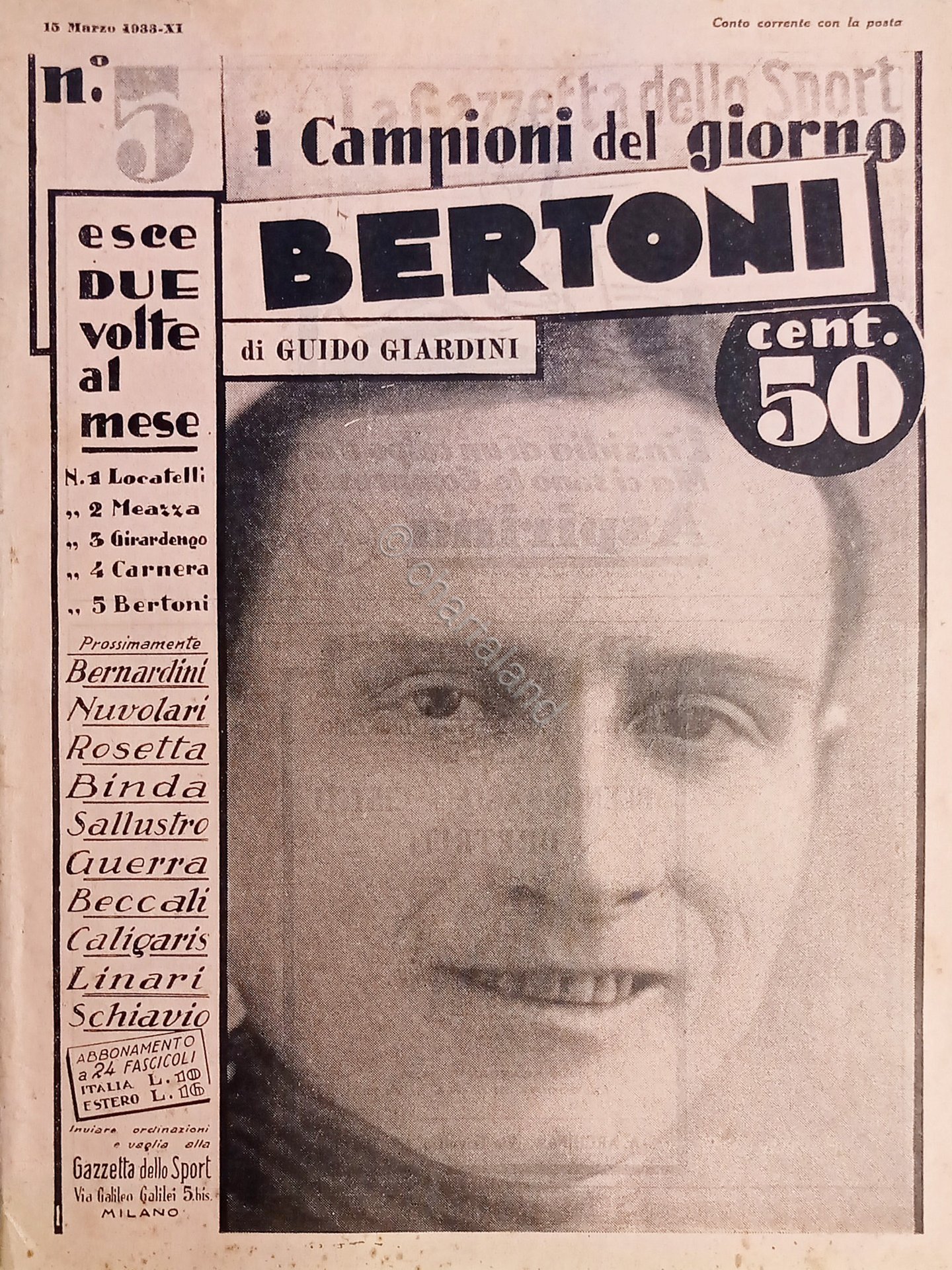 Rivista Ciclismo - I Campioni del Giorno N. 5 Bertoni - di Guido Giardini - 1933