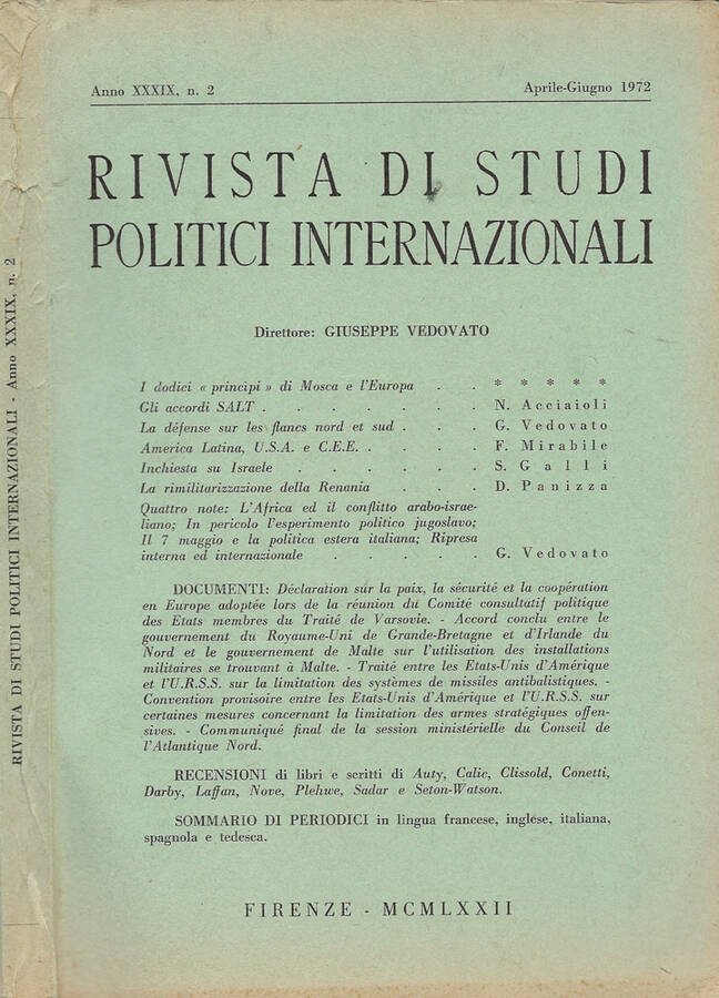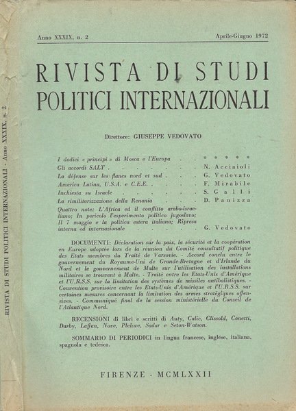 Raccolta incompleta anno 1972 della rivista diretta da Giuseppe Vedovato, disponibile: Anno XXXIX, N. 2 (Aprile-Giugno), coperta imbrunita maggiormente ai margini e al dorso, tagli e pagine con lievissima imbrunitura, testo completamente fruibile, note a piè di pagina, lingue: italiano e francese, numero pagine 183