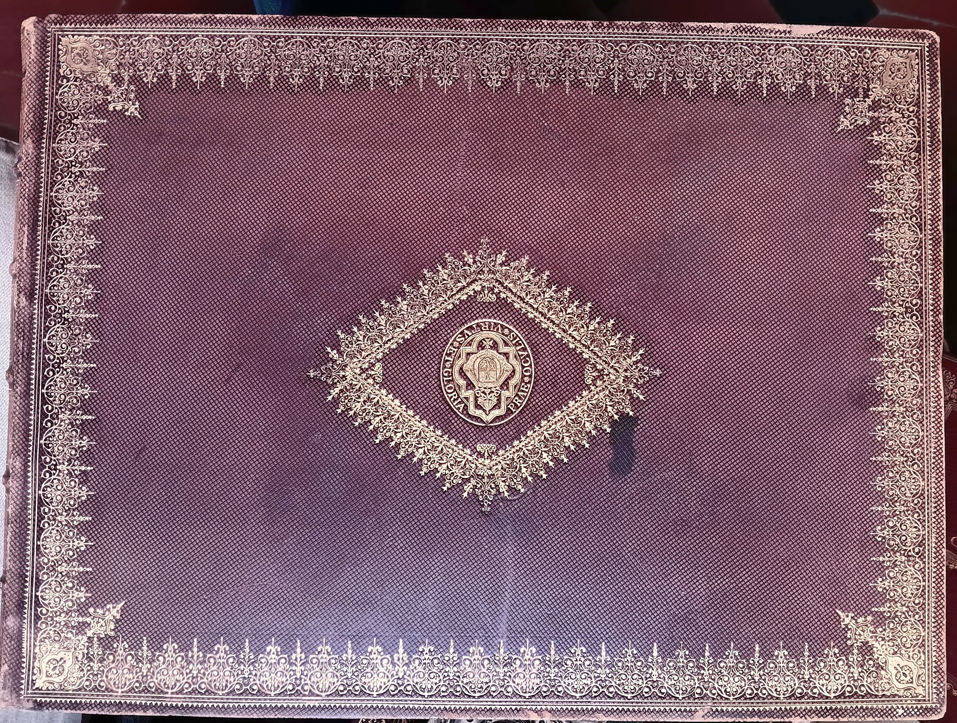 In-8¡ oblungo, (31x41x3) Collezione di 20 fotografie in b/n di quadri provenienti dalla Galleria Borghese, legatura in cuoio zigrinato con cornice dorata ed angoli su entrambi i piatti. Dentelle interna. Armi Borghese (motto: Prae Oculis Virtus et Gloria) entro losanga dorata su entrambi i piatti. Dorso a cinque nervature con fregi in oro, tagli in oro, seconda metˆ del XIX secolo