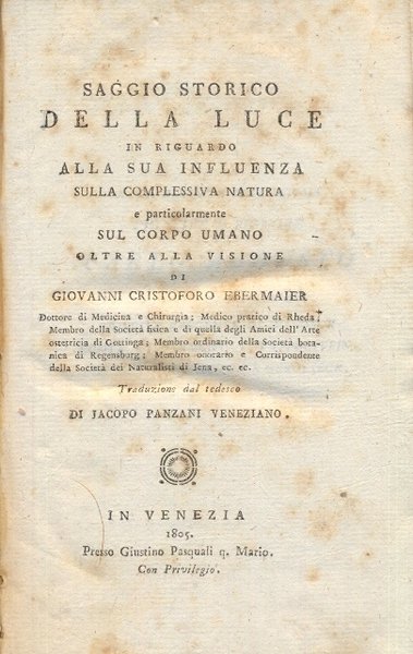 Saggio storico della luce in riguardo alla sua influenza sulla complessiva natura e particolarmente sul corpo umano. | Libri antichi e moderni | Ebermaier Giovanni Cristoforo.