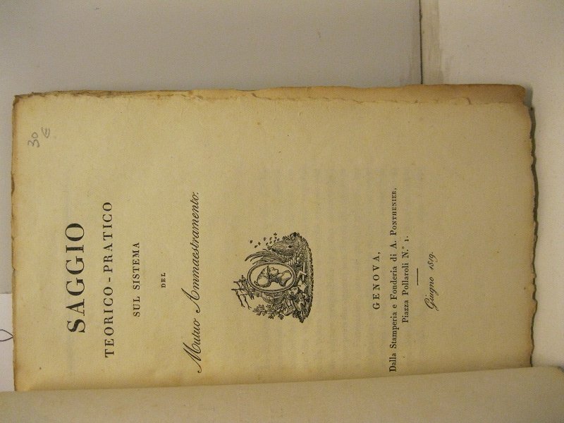 In 8, pp. VIII + 17 + (3b). Br. muta coeva. Saggio pubblicato anonimo dul sistema del 'mutuo ammaestramento': 'scopo di questo sistema e' di condurre i giovani per una strada piu' facile, piu' breve e piu' sicura ed apprendere l'arte di ben leggere, scrivere e computare. Esso consiste principalmente in questo, che l'ammaestramento si da' e si comunica dagli Alunni piu' esperti ai meno esperti.'. Dura, 15896.