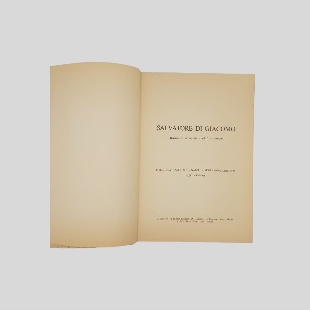 In-8°, pp. 160. Saggio-Catalogo della mostra tenutasi presso la Biblioteca nazionale di Napoli [aprile-novembre 1984]. Con ill. f.t. Fioriture alla copertina e ai tagli, interno in buono stato. Catalogo della mostra allestita in occasione del cinquantenario della morte di Salvatore Di Giacomo. Contributi di: Maria Angarano, Gianni Cesarini, Arturo Fratta, Ettore Gentile, Gianni Infusino. Scritti critici di Giovanni Artieri, Elena Bacaloglu, Antonio Bellucci, Libero Bovio, Guido Burgada, Benedetto Croce, Elena Croce, Gino Doria, E.A. Mario, Eugenio Montale, Enzo Petraccone, Pasquale Pironti, Pasquale Ruocco.