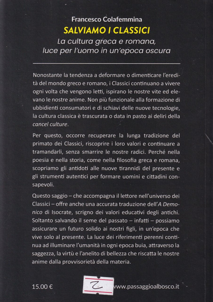 Salviamo i classici. La cultura greca e romana, luce per l'uomo in un'epoca oscura | Libri antichi e moderni | Colafemmina, Francesco