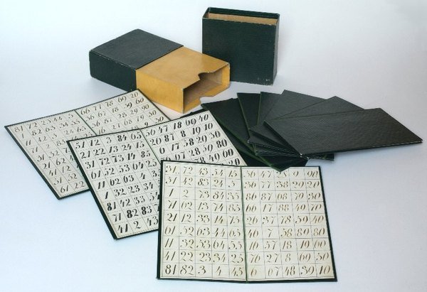 11 Faltbrettchen (je ca. 207:191 mm) mit Leinengelenk und aufgezogenen Spielfeldern (geteilt in neun mal zehn Felder; die jeweiligen Zahlenwerte von 1 bis 90 in zufälliger Anordnung mit Tinte eingetragen). Zusammen in maßgefertigtem Original-Kartonschuber. Hübscher, wie der passgenaue Originalschuber belegt, vollständiger Satz von elf Lottobrettern, jedes in neun mal zehn Felder von 1 bis 90 geteilt. - Das im 16. Jahrhundert in Italien entwickelte Lottospiel hatte in den folgenden Jahrhunderten einen Siegeszug durch Europa angetreten, war in Frankreich stark raffiniert worden und diente vielen Regierungen als bequeme zusätzliche Einnahmequelle. Obwohl man dem vom Kindern gepflogenen Spielen grundsätzlich skeptisch gegenüberstand, gebrauchte man das Lottospiel insbesondere in Deutschland gerne als pädagogisches Instrument, um Kindern Schreiben, Tiernamen wie auch Multiplikation beizubringen - ein Zweck, dem auch das vorliegende Set gedient haben dürfte, wie die zahlreichen Bleistiftproben, Kinderzeichnungen und Schreibübungen auf mehreren der Brettchen belegen. - Ecken teils minimal bestoßen (am Schuber stärker); im ganzen von hübscher Erhaltung.